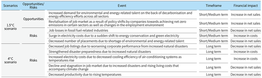 To build a sustainable future, it is essential to address climate change, starting with the reduction of greenhouse gases (GHG). Doing so will make it possible to protect the lobal environment, maintain a balance between ecosystems, and provide a better environment for future generations. In terms of how these issues affect JAC Group, as temperatures rise and the severity of natural disaster worsens, the potential impacts on JAC Group's operations and performance, including shifts in the corporate recruitment business and cost structures, become increasingly significant.