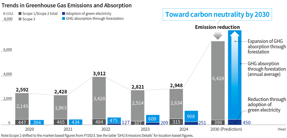 The Group has set a target to achieve carbon neutrality by FY2030 as our greenhouse gas emission reduction goal, encompassing Scope 1 to 3 emissions. We are committed to reducing GHG emissions in our business activities, procuring green electricity, and expanding GHG absorption through forestation efforts. In addition, by placing personnel who foster innovation, we aim to drive the transition to carbon neutrality across society.