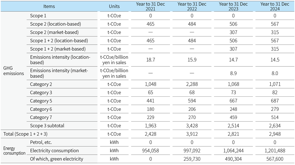 In FY2024, GHG emissions (Scope 1 + 2 + 3; market basis) were 2,948 t-CO2e, up 4.5% from the last year, due to the expansion of business activities.