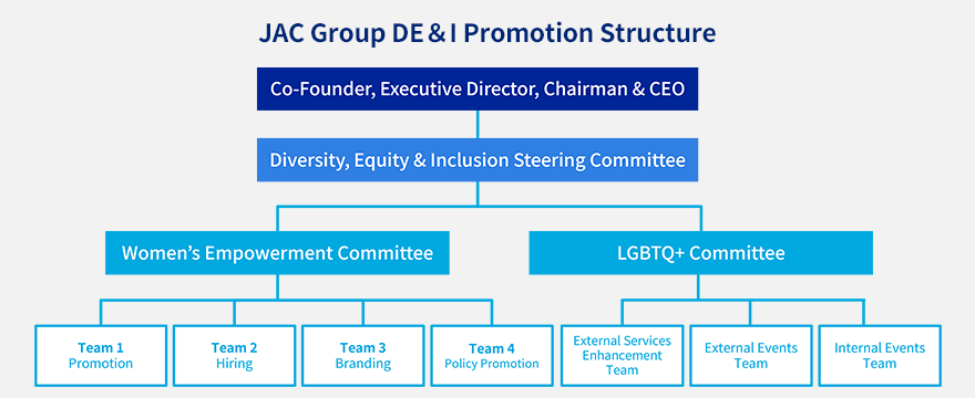 As of 2024, we have added equity (i.e. fairness and the elimination of disparities) to diversity, which refers to a broad variety of human resources co-existing without discrimination, and inclusion, which refers to everyone being welcome and having a feeling of reassurance and unity, and changed the name of the committee to JAC Group Diversity, Equity & Inclusion Steering Committee. With this committee taking the lead, we are working on initiatives to provide an environment and opportunities so that anyone can play an even more active role.