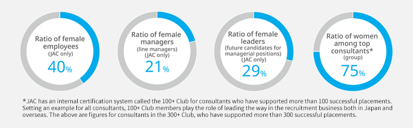 Ever since it was founded, JAC Group has been run as an organisation that provides all employees, regardless of their age or gender, with fair opportunities to leverage their individual strengths and capabilities to play an active role. As a result, 75% of our top consultants who have provided support for more than 300 successful placements are women.