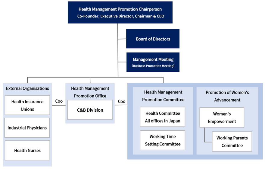 JAC Group(*) promotes health management with the Co-Founder, Chairman, CEO, and Managing Director as the Health Management Promotion Chairperson. A health promotion officer is appointed in the Health Management Promotion Office to examine measures and monitor their effectiveness in cooperation with internal and external parties. The Health Management Promotion Committee, which is made up of employees and meets regularly, discusses workplace safety, health and working styles and shares information across the organisation. In addition, Woman's Empowerment Committee, which is responsible for promoting the advancement of women, and Working Parents Committee, which is responsible for promoting support for balancing childcare, promote the creation of an environment in which employees can remain active for a long time while aiming for career challenges and skill development even during life events, and make proposals to the management meeting. In cooperation with external organisations such as health insurance unions, industrial physicians and public health nurses, we promote activities to improve and maintain the health of our employees.