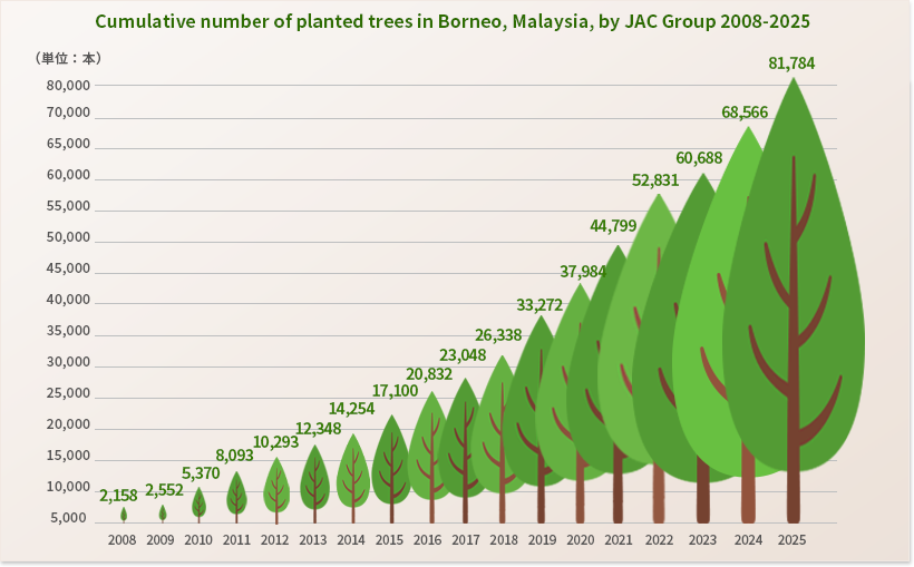 Between 2008 and 2025, the JAC Group planted a cumulative total of 81,784 trees in Borneo, Malaysia.
