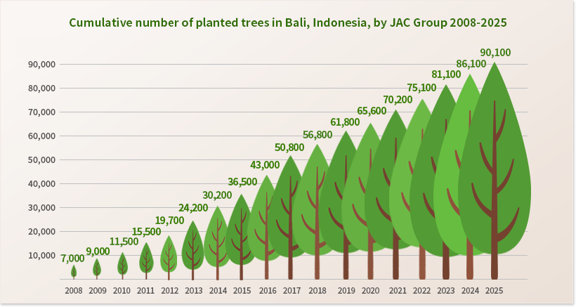 Between 2008 and 2025, the JAC Group planted a cumulative total of 90,100 trees in the Mount Batur area of Bali, Indonesia.
