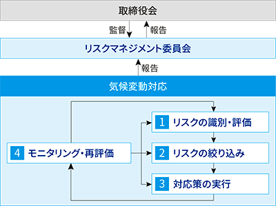 気候変動リスクに関しても、当社グループの経営に重大な影響を及ぼす可能性のあるリスクの一つとして、この枠組みにのっとって、重要リスクの絞り込み、モニタリングと再評価を実施しています。