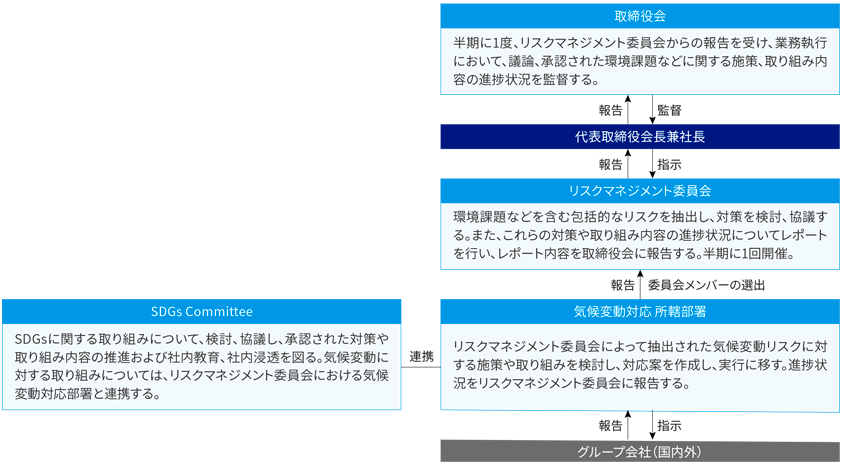 気候変動関連のリスクと機会を評価、管理するうえでの経営の役割を、下図のとおり定め、ガバナンス体制を構築しています。