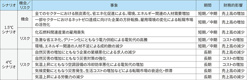 上記シナリオをベースに分析、識別、特定した主要な機会とリスク、時間軸、および財務的影響は以下のとおりです。