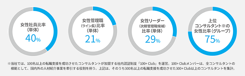 当社の女性社員比率は単体で40%、グループ全体では46%で、多くの女性社員が活躍しています。当社グループでは、創業時より年齢や性別にかかわらずすべての社員が公平に個々の強みや能力を発揮し、活躍できる組織運営を行っており、その結果、300件以上の転職支援を成功させた上位コンサルタントの75%が女性コンサルタントで占められています。
