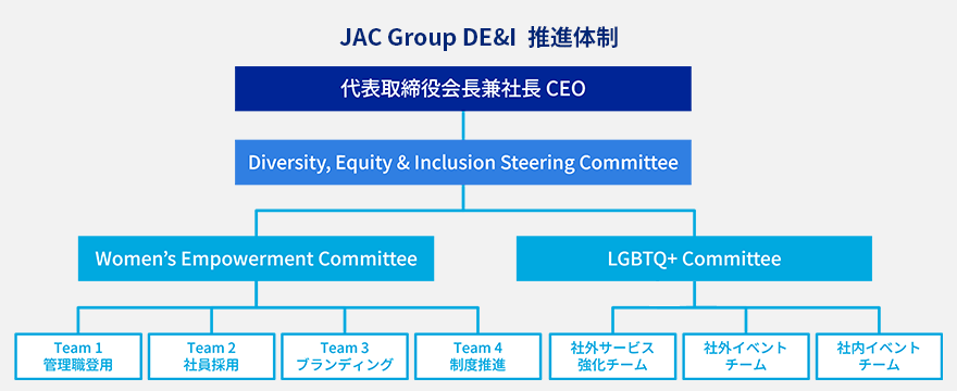 さらにD&Iの推進を強化するため、2021年6月に「JAC Group Diversity & Inclusion Steering Committee」を立ち上げ、この下に「Women's Empowerment Committee」と「LGBTQ+ Committee」を設けて活動を続けてきました。多様な人材が差別なく存在する「Diversity(多様性)」、誰もが歓迎され、心理的に安心感と一体感をもつ「Inclusion(包括性)」に、2024年からは「Equity(公平性・格差是正)」を加え、組織名称も「JAC Group Diversity, Equity & Inclusion Steering Committee」に変更し、コミッティがけん引しながら、誰もがさらに活躍できる環境や機会を提供する取り組みを推進しています。
