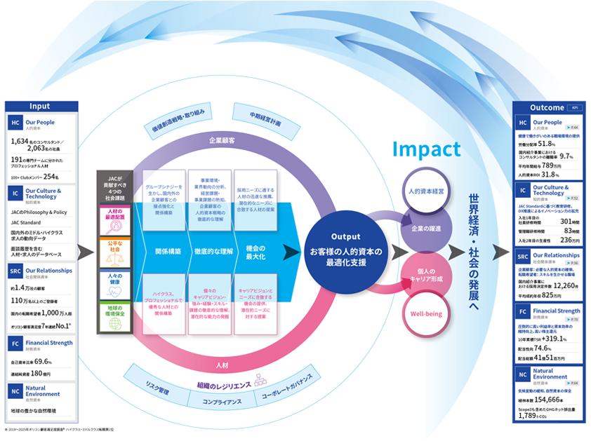 JACグループは、創業以来、一貫して「人」の重要性に着目し、企業の人材戦略を支える人的資本の最適化を支援してきました。「人」を取り巻くさまざまな社会課題を把握し、企業側・人材側の両方と強い関係性を構築して、深く理解し、潜在的なニーズや活躍の場を創造する、そして、最適なポジションに最適な人材をつなぐ、それが当社グループの価値創造プロセスです。これにより、企業の躍進とキャンディデイト(候補者)の活躍を実現し、経済・社会の発展を支えていきます。