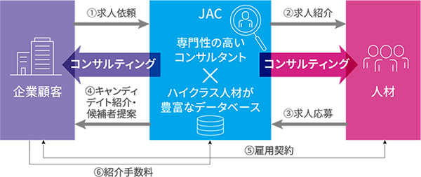 当社の人材紹介の特長は、専門性の高いコンサルテーションです。各業種・職種について専門知識をもつ経験豊富なコンサルタントが、企業とキャンディデイト(候補者)の双方と対話をしながら、最適な人材を、最適なポジションへとご紹介しています。